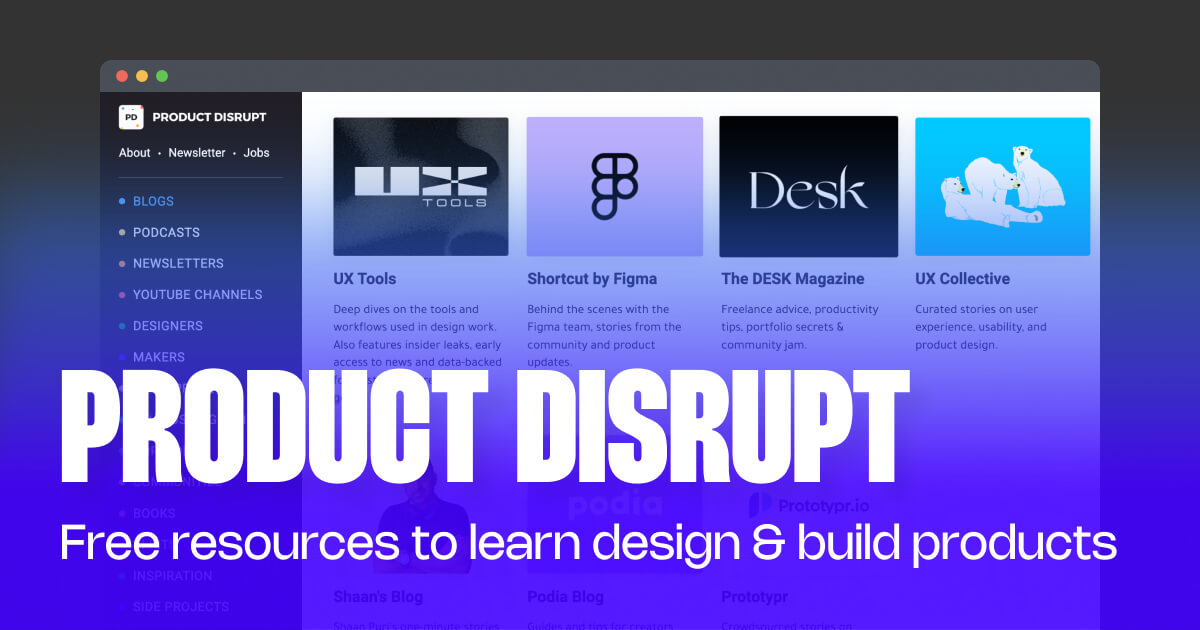 Product Disrupt is a curated list of resources to learn product design from the internet. Think of it as a guide to your DIY design education.