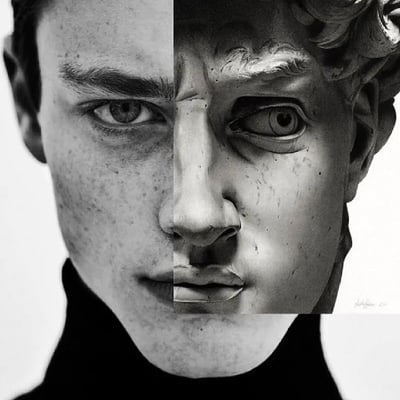 Surreal AI Concept Art with Statue Hand and Letter Beads